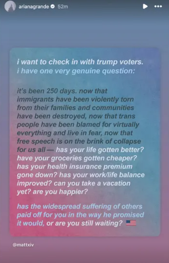 In her Instagram Stories, Grande reshared a post that directly addressed Trump supporters, asking if the former president had actually delivered on his promises. The post pointed out campaign pledges such as lowering insurance premiums and reducing the cost of groceries, raising the question of whether these so-called economic gains were even realized.