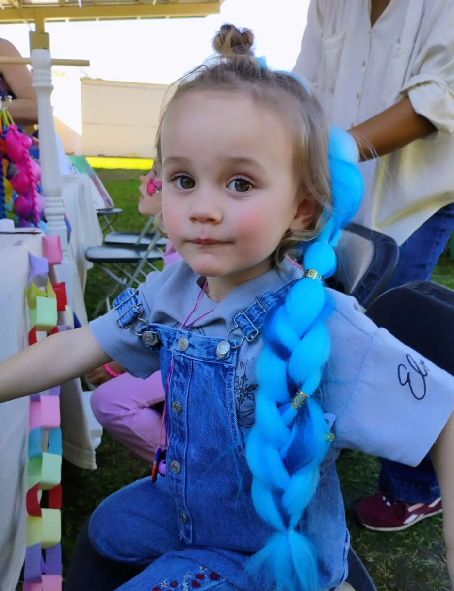In a second snap, Matilda appeared seated outdoors, sporting a playful faux blue braided ponytail — a look that instantly charmed fans and highlighted her budding personality.