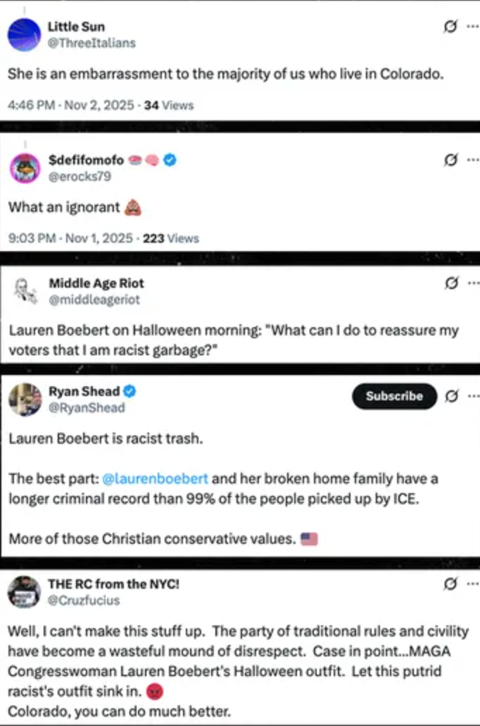 Critics, however, argue that the response completely ignores the nature of the backlash — accusing Boebert of deflecting blame and refusing to acknowledge why the costume offended so many.
