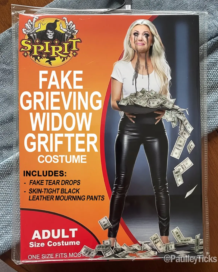 In the image, Erika Kirk is shown shedding exaggerated “fake tears,” with smeared eyeliner running dramatically down her body. The fake packaging described her outfit as “skin-tight black leather mourning pants” and included a bag overflowing with money — implying she was profiting from her husband’s death.