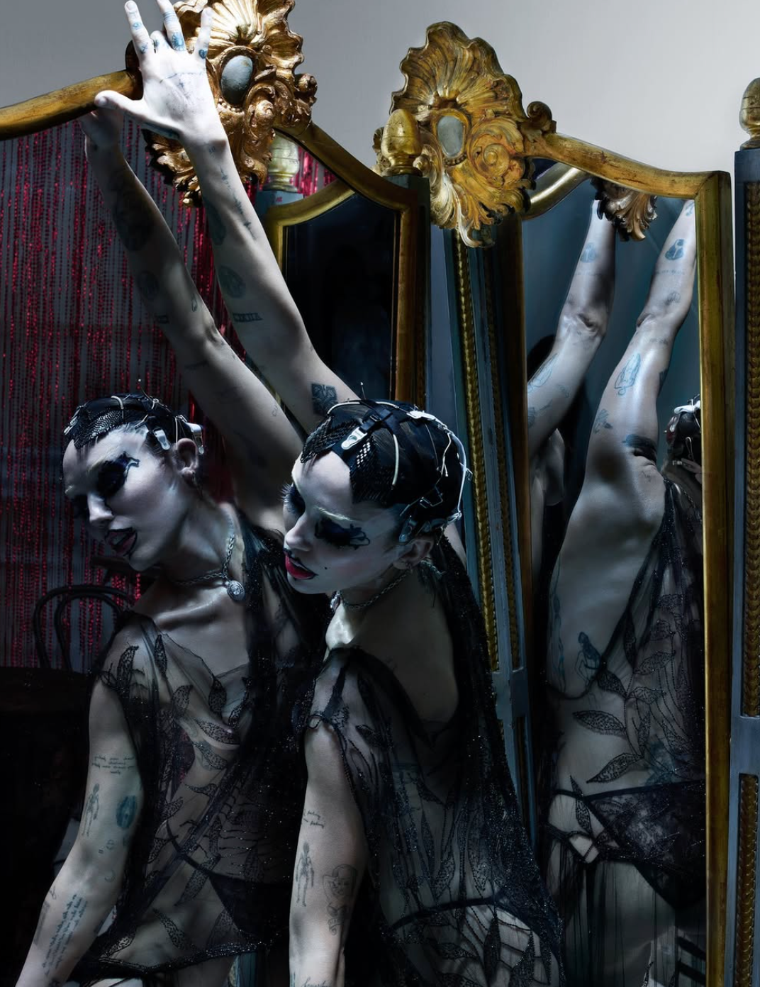 But it was the final look that set the internet ablaze. Posing in a sheer black beaded gown before an ornate mirror, Cyrus created a haunting reflection that fans are calling “a gothic masterpiece.” With shimmering blue eyeshadow, razor-sharp eyeliner, and her signature crimson lips, the 32-year-old leaned into avant-garde drama.