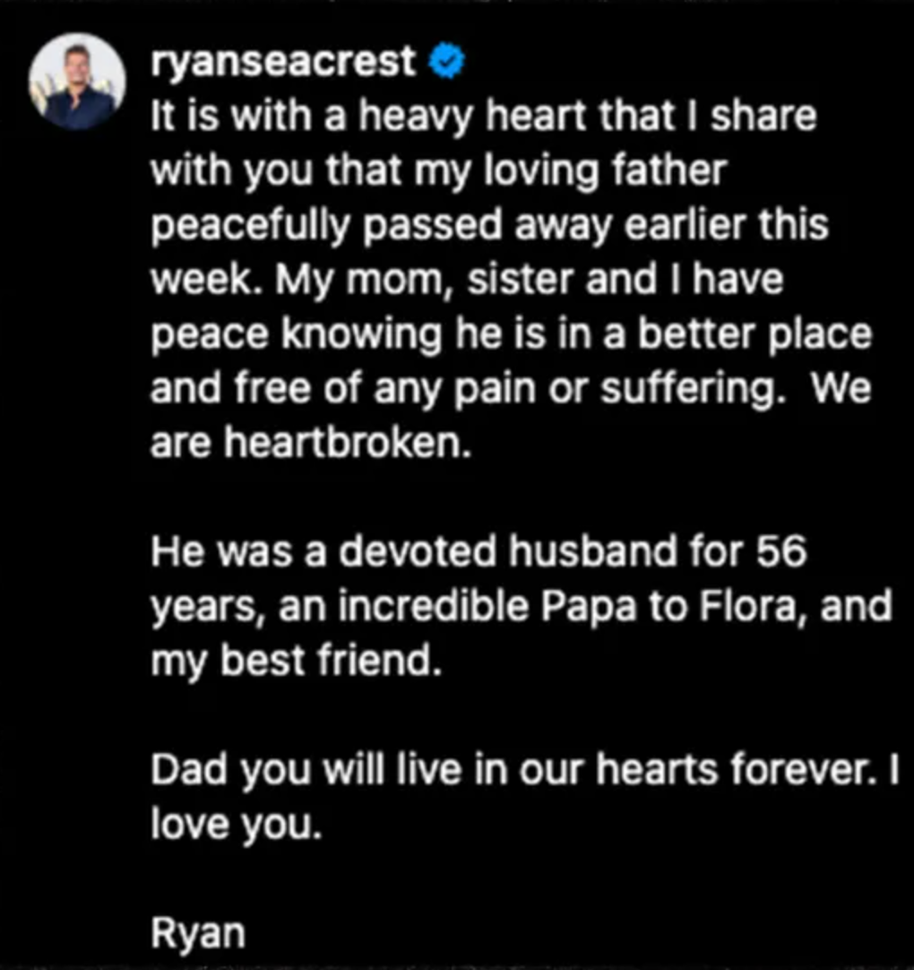 Taking to Instagram on Friday, Ryan shared an emotional tribute alongside a series of family photos, revealing that his father “peacefully passed away earlier this week.”