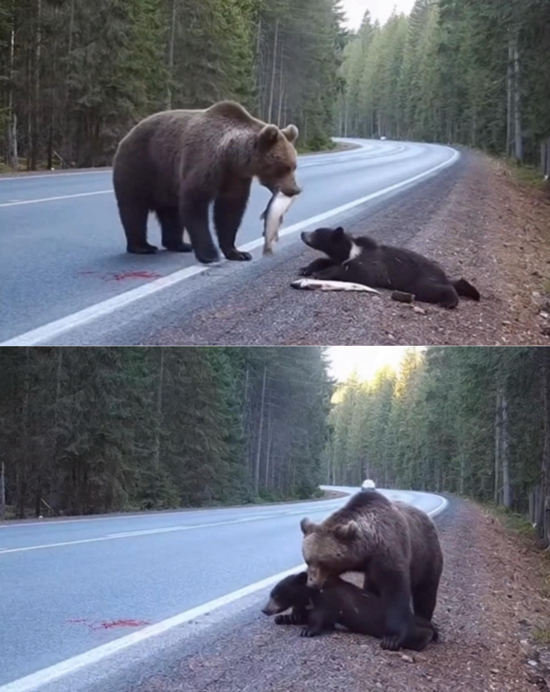 A car collision on a forest road left a small bear cub severely injured, its tiny body broken and helpless. The cub’s mother, frantic and terrified, arrived moments later. Her baby was still alive, but in agony — and there was nothing she could do alone.